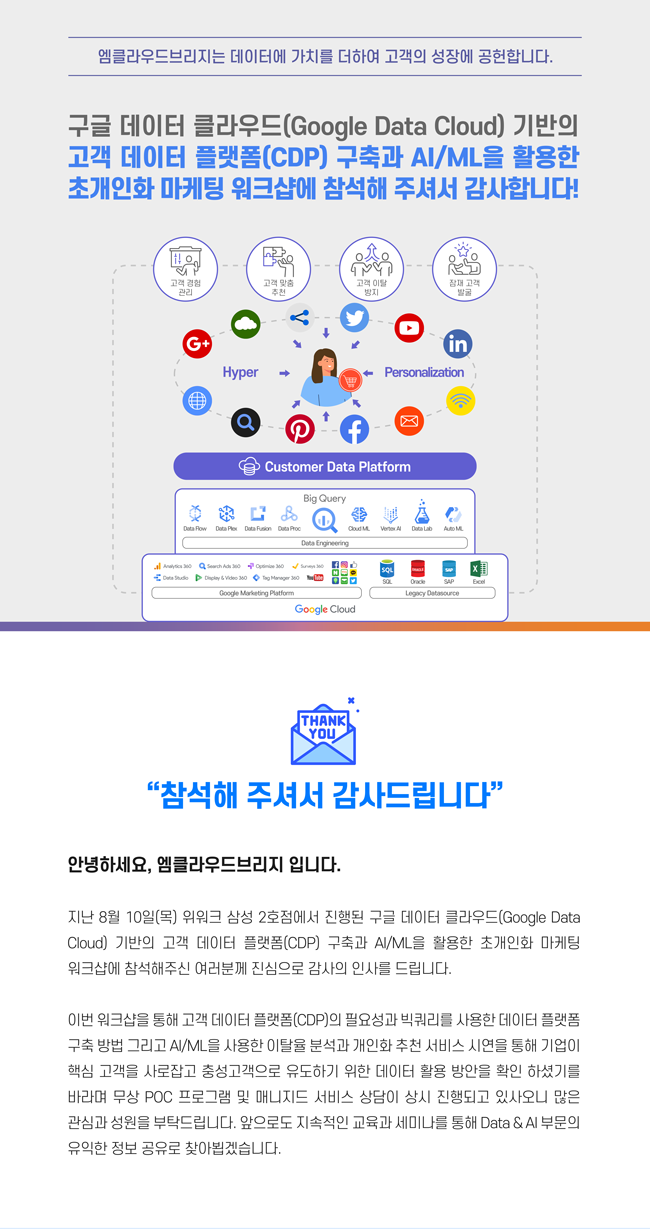구글 데이터 클라우드(Google Data Cloud) 기반의 고객 데이터 플랫폼(CDP) 구축과 AI/ML을 활용한 초개인화 마케팅 워크샵에 참석해 주셔서 감사합니다!
