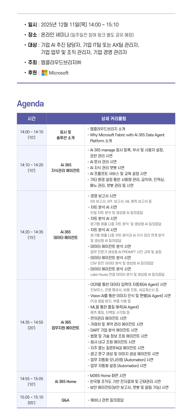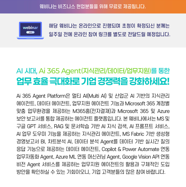 Ai 365 Agent Platform은 멀티AI (Multi AI) 및 산업군 AI 기반의 지식관리 에이전트, 데이터 에이전트, 업무지원 에이전트 기능과 Microsoft 365 계정별 맞춤 업무환경을 제공하는 M365홈(전자결재)과 Microsoft 365 및 Azure 보안 보고서를 통합 제공하는 에이전트 플랫폼입니다. 본 웨비나에서는 MS 및 구글 GPT 서비스, RAG 및 문서학습 기반 AI 지식검색, AI 프롬프트 서비스, AI 업무 도우미 기능을 제공하는 지식관리 에이전트, MS Fabric 기반 생성형 경영보고서 BI, 차트분석 AI, 데이터 분석 Agent를 데이터 기반 실시간 질의 응답 기능으로 제공하는 데이터 에이전트, Copilot & Power Automate 연동 업무자동화 Agent, Azure ML 연동 머신러닝 Agent, Google Vision API 연동 비전 Agent 서비스를 제공하는 업무지원 에이전트의 활용과 구체적인 도입 방안을 확인하실 수 있습니다.