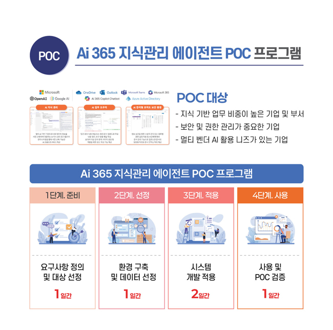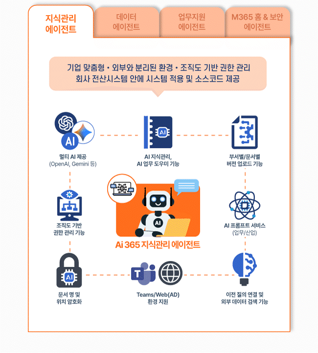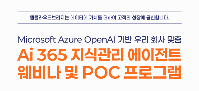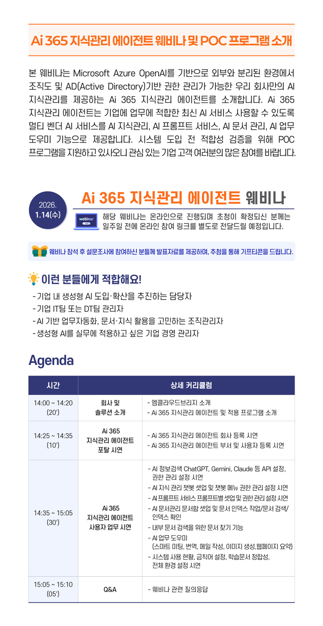 본 웨비나는 Microsoft Azure OpenAI를 기반으로 외부와 분리된 환경에서 조직도 및 AD(Active Directory)기반 권한 관리가 가능한 우리 회사만의 AI 지식관리를 제공하는 Ai 365 지식관리 에이전트를 소개합니다. Ai 365 지식관리 에이전트는 기업 업무에 적합한 최신 AI 지식관리, AI 프롬프트 서비스, AI 문서관리 AI 업무 도우미 기능으로 제공합니다. 시스템 도입 전 적합성 검증을 위해 POC 프로그램을 지원하고 있사오니 관심 있는 기업 고객 여러분의 많은 참여를 바랍니다.
