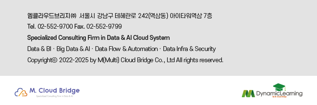 Data & AI 통합 업무 플랫폼 전문 기업 엠클라우드브리지는 고객의 성공적인 비즈니스를 위한 클라우드 여정을 함께합니다.