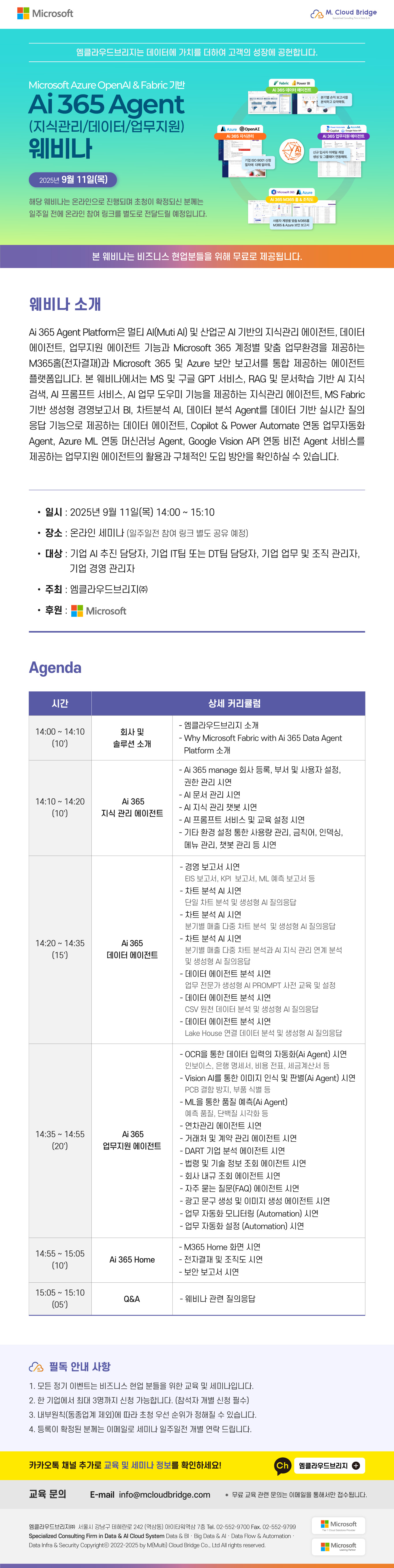 교육명 [온라인 세미나] Microsoft Azure OpenAI & Fabric 기반 Ai 365 Agent(지식관리/데이터/업무지원) 웨비나