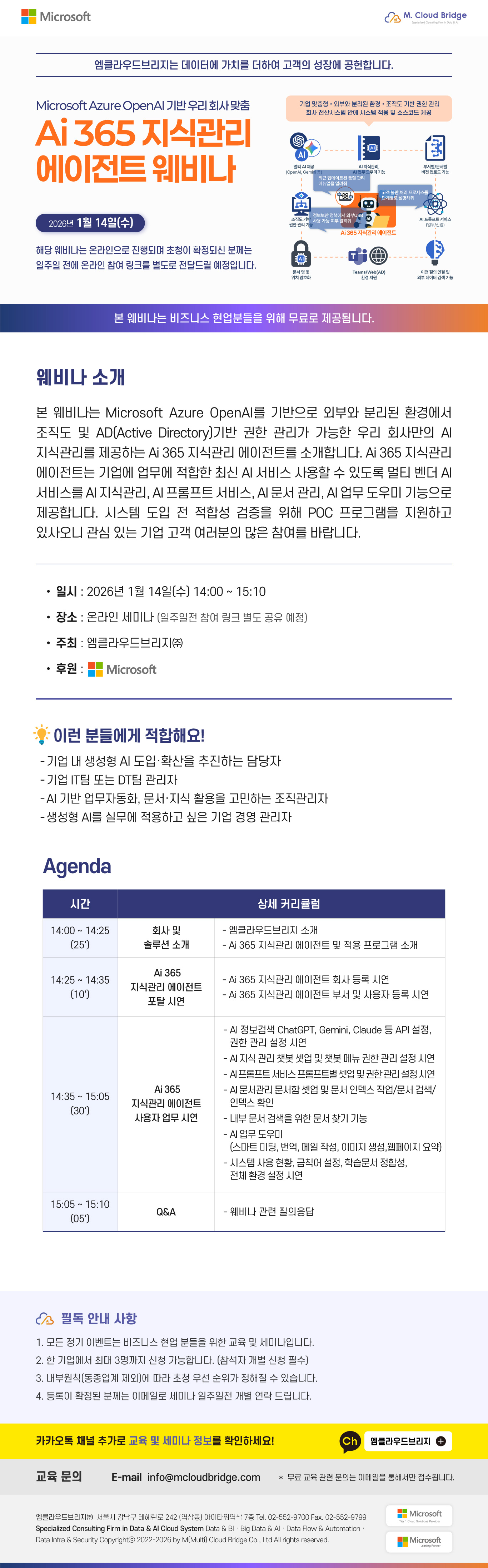 교육명 [온라인 세미나] Microsoft Azure OpenAI 기반 Ai 365 지식관리 에이전트 웨비나