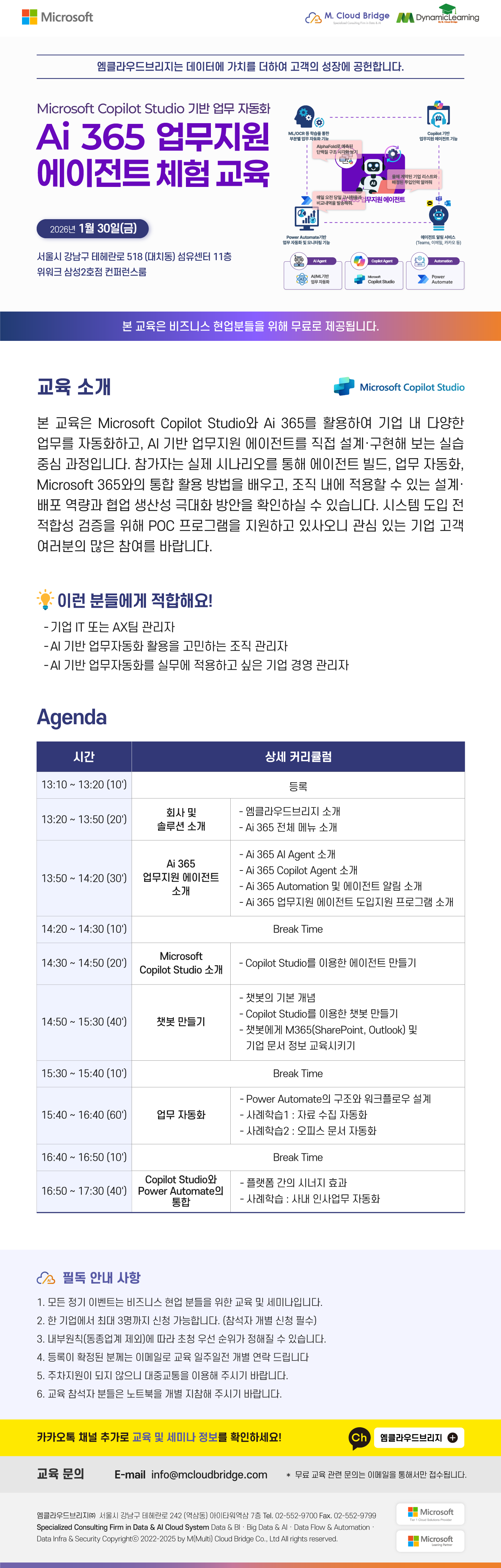 교육명 Microsoft Copilot Studio 기반 업무 자동화 Ai 365 업무지원 에이전트 체험 교육