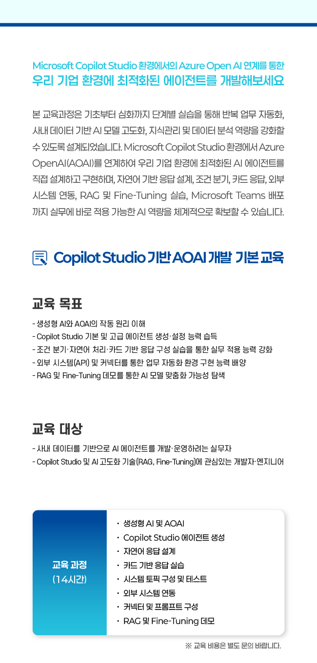 Microsoft Copilot Studio 환경에서의 Azure Open AI 연계를 통한 우리 기업 환경에 최적화된 에이전트를 개발해보세요 본 교육과정은 기초부터 심화까지 단계별 실습을 통해 반복 업무 자동화, 사내 데이터 기반 AI 모델 고도화, 지식관리 및 데이터 분석 역량을 강화할 수 있도록 설계되었습니다. Microsoft Copilot Studio 환경에서 Azure OpenAI(AOAI)를 연계하여 우리 기업 환경에 최적화된 AI 에이전트를 직접 설계하고 구현하며, 자연어 기반 응답 설계, 조건 분기, 카드 응답, 외부시스템 연동, RAG 및 Fine-Tuning 실습, Microsoft Teams 배포 까지 실무에 바로 적용 가능한 AI 역량을 체계적으로 확보할 수 있습니다.