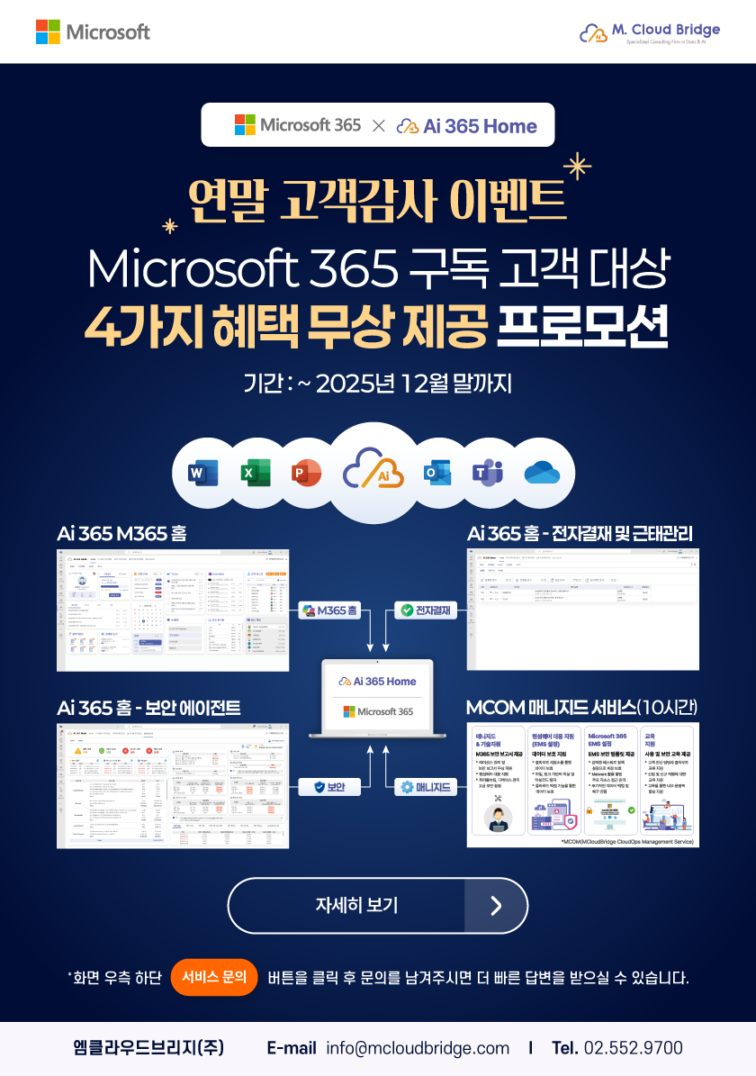 AI 통합 업무 플랫폼 전문기업 엠클라우드브리지의 Ai 365 업무지원 에이전트 적용 서비스와 매월 무료 체험 교육 및 세미나&이벤트 정보를 지금 만나보세요!