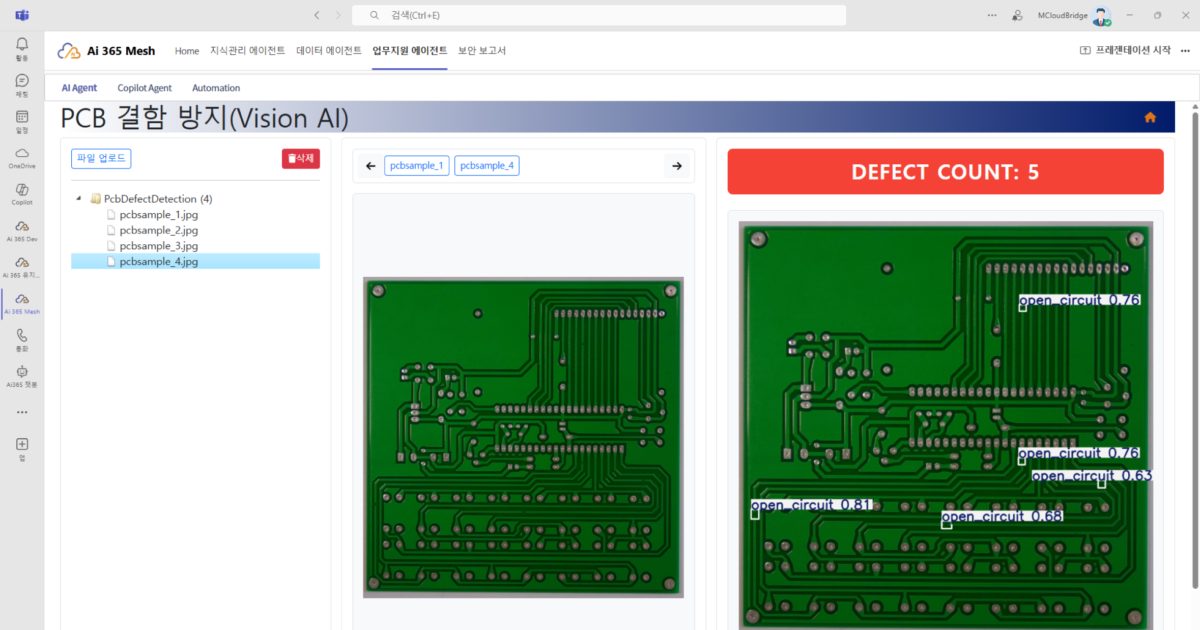 Ai 365 업무지원 에이전트의 AI Agent는 이미지와 문서 데이터를 자동으로 인식·분석하여 반복적이고 복잡한 업무를 효율화 합니다. PCB 결함을 몇 초 만에 감지하고, 단백질 서열로 3D 구조를 예측하며, 부품 이미지를 즉시 식별하고, 세금계산서의 주요 정보를 자동 추출해 업무 정확성과 속도를 향상시킵니다.