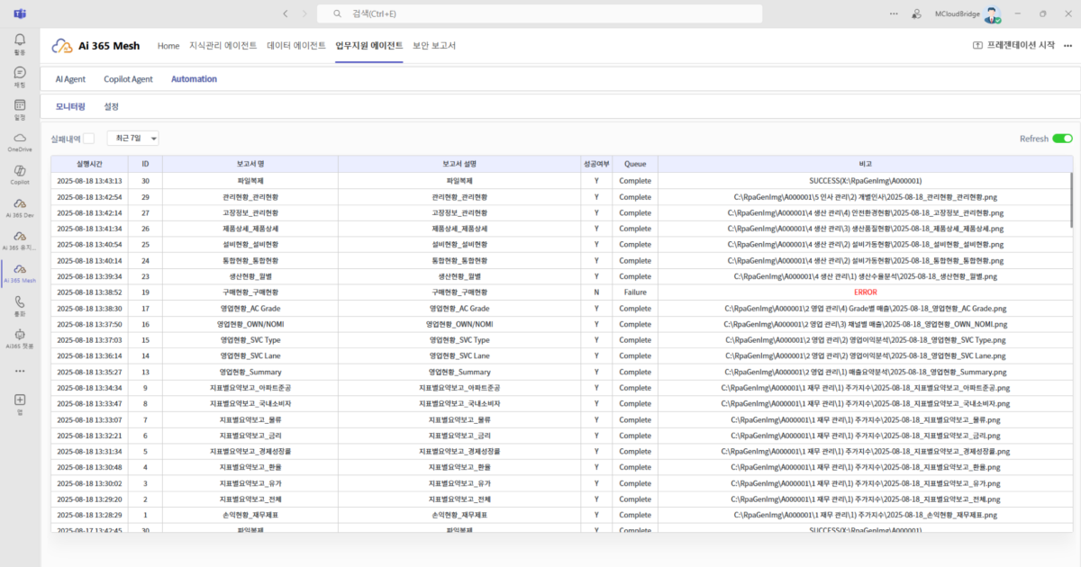 Ai 365 업무지원 에이전트의 Automation은 반복적인 업무를 자동화하고, 설정된 프로세스를 실시간으로 모니터링하여 운영 효율을 높입니다. 사용자는 간단한 설정만으로 다양한 업무 흐름을 자동화할 수 있으며, 자동화 상태를 직관적으로 확인하고 관리할 수 있어 안정적인 업무 운영이 가능합니다.
