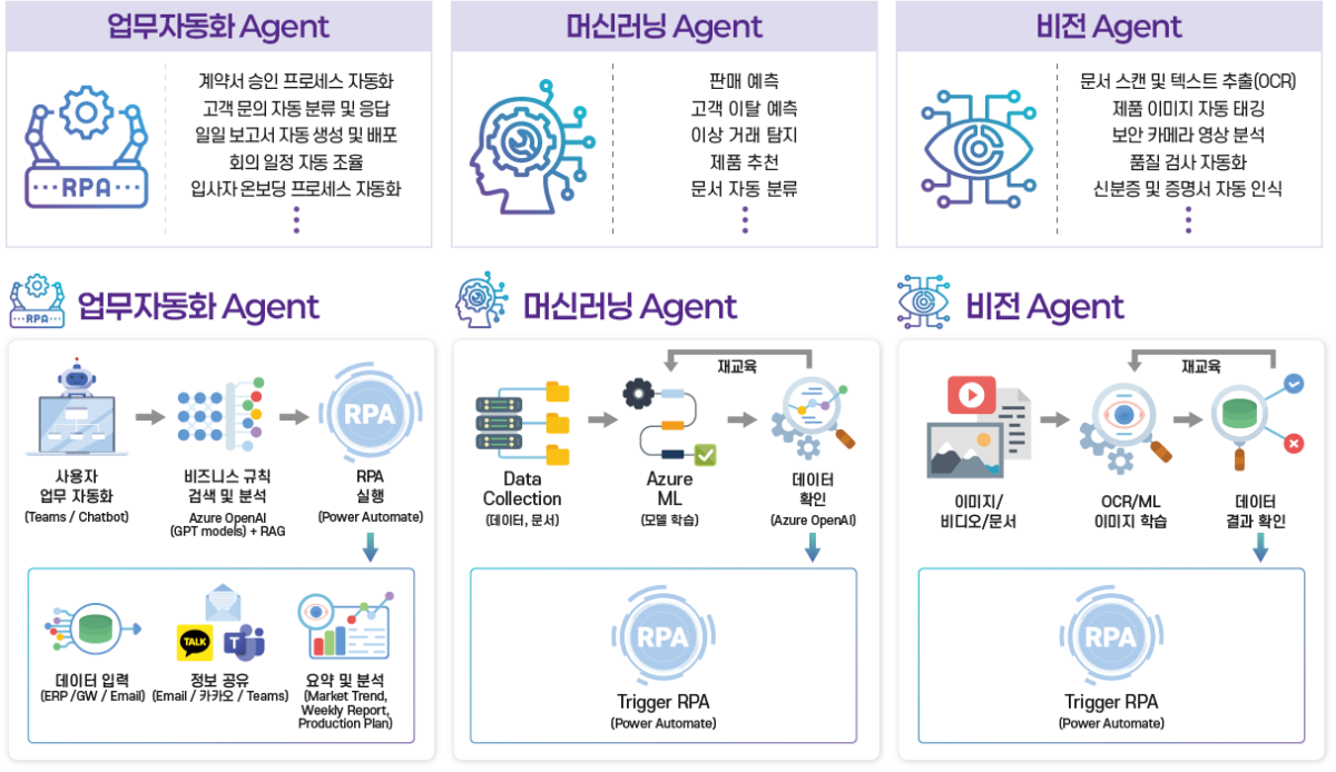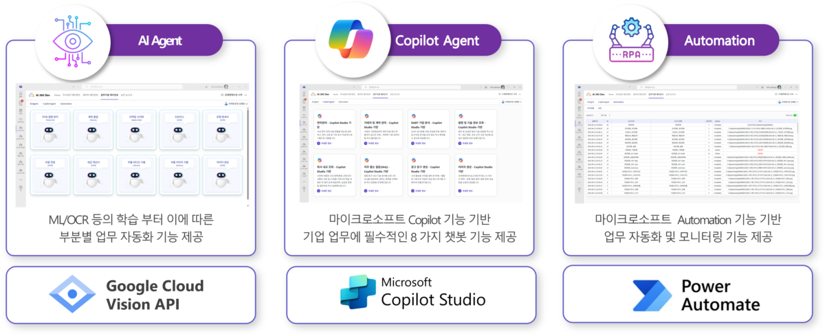 Ai 365 업무지원 에이전트는 Azure OpenAI와 RAG기술을 활용하여 기업 내 문서와 정보를 신속히 검색하고 자연어로 응답하는 업무환경을 Google Cloud Vison API 연동 비전 Agent, Copilot Studio 연동 업무 Agent, Power Automate 연동 업무 자동화 Agent를 비즈니스 맞춤 지능형 에이전트로 제공합니다.