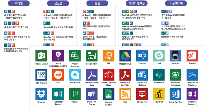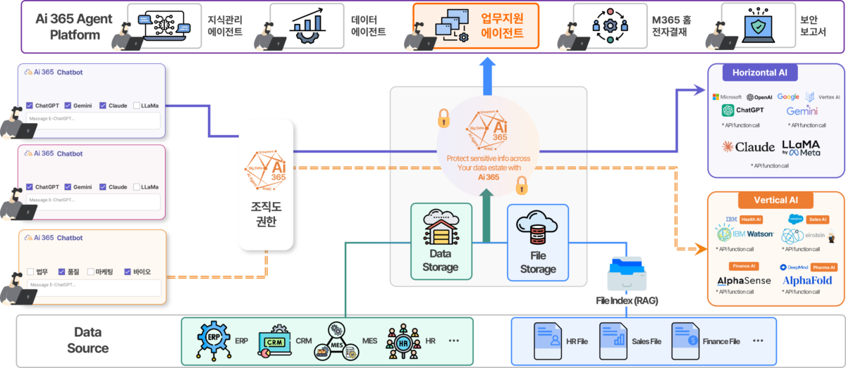 Ai 365 Agent Platform을 통하여 사용자는 지식관리 에이전트, 데이터 에이전트, 업무지원 에이전트 그리고 M365홈 및 보안보고서를 단일 업무 플랫폼을 통해 사용을 할 수 있으며, 필요시 산업군 업무 확장을 위해 마이크로소프트, 구글, 또는 전문 산업군 API를 업무에 추가 사용 할 수 있습니다.