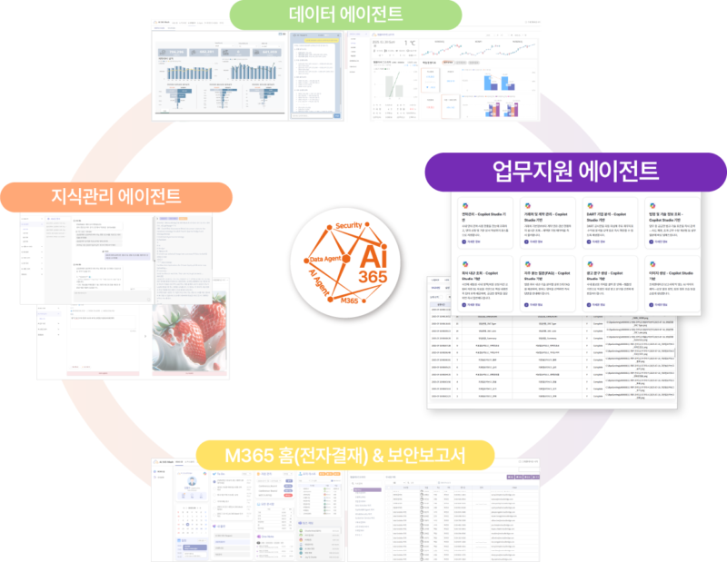 Ai 365 Agent Platform은 멀티 AI(Muti AI) 및 산업군 AI기반의 지식관리 에이전트, 데이터 에이전트, 업무지원 에이전트 기능과 Microsoft 365 계정별 맞춤 업무환경을 제공하는 M365홈(전자결재)과 Microsoft 365 및 Azure 보안 보고서를 통합 제공하는 에이전트 플랫폼입니다.