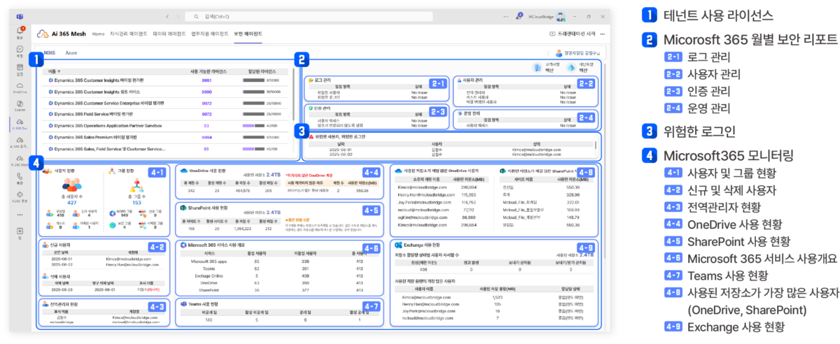 Ai 365 보안 에이전트의 Microsoft 365 보안 보고서는 사용 라이선스 현황 , Microsoft 365 월별 보안 리포트, 사용자 및 그룹 현황, 사용현황(OneDrive, SharePoint, Teams, Exchange 등) 현황 등을 확인 할 수 있는 대시보드를 제공하여 Microsoft 365 사용 및 보안 모니터링이 가능한 환경을 제공합니다.