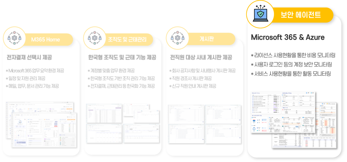 Microsoft 365 Business Premium 100 사용자 이상 구독 고객사에 Microsoft 365 사용자 계정별 맞춤 홈을 제공하는 Ai 365 홈, 한국형 조직도 기반 Ai 365 전자결재와 근태관리, M365와 Azure 보안 보고서 및 보안 챗봇을 제공하는 Ai 365 보안 에이전트 그리고 M365 운영 관리를 위한 MCOM 매니지드 서비스 10시간을 무상 제공하는 혜택을 제공하오니 기업 고객 분들의 많은 문의를 바랍니다.