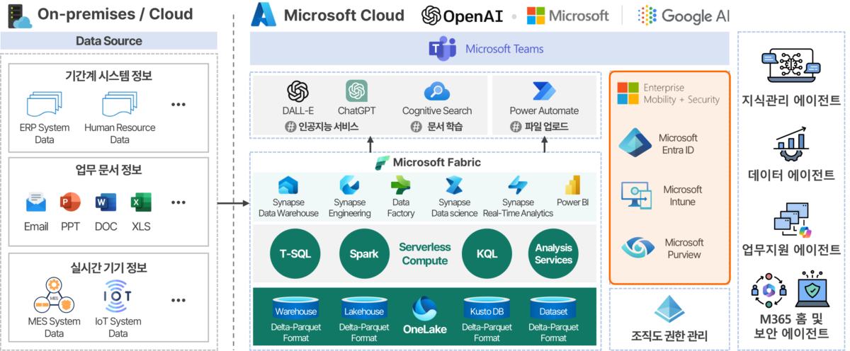 Ai 365 AI Agent Platform은 글로벌 생성형 AI 플랫폼 기반으로 기업의 클라우드 또는 온프레미스의 데이터와 Microsoft 365에 보유한 사용자 정보를 통합하고, 이를 Microsoft 데이터 플랫폼(Fabric) 및 AI Search 서비스로 생성된 정보를 챗GPT, Gemini 등의 에이전트 챗봇을 팀즈 환경에서 사용자에게 제공합니다.