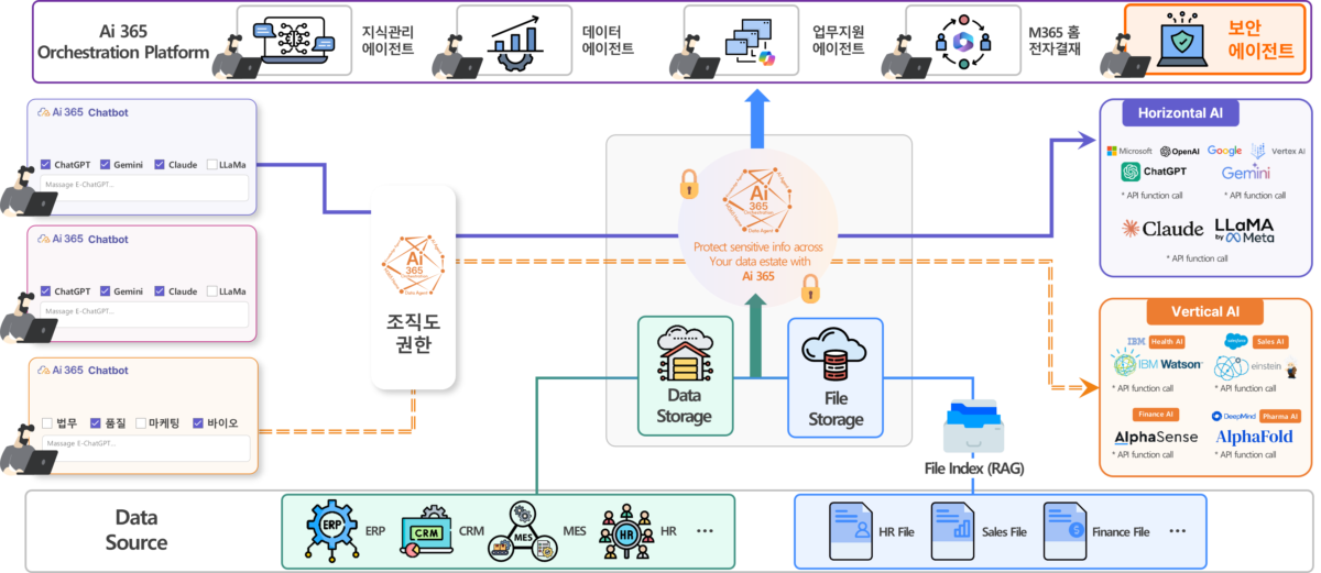 Ai 365 AI Agent Platform을 통하여 사용자는 지식관리 에이전트, 데이터 에이전트, 업무지원 에이전트 그리고 M365홈 및 보안 에이전트를 단일 업무 플랫폼을 통해 사용을 할 수 있으며, 필요시 산업군 업무 확장을 위해 마이크로소프트, 구글, 또는 전문 산업군 API를 업무에 추가 사용 할 수 있습니다.