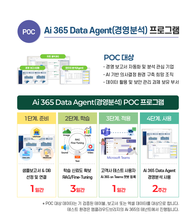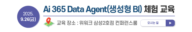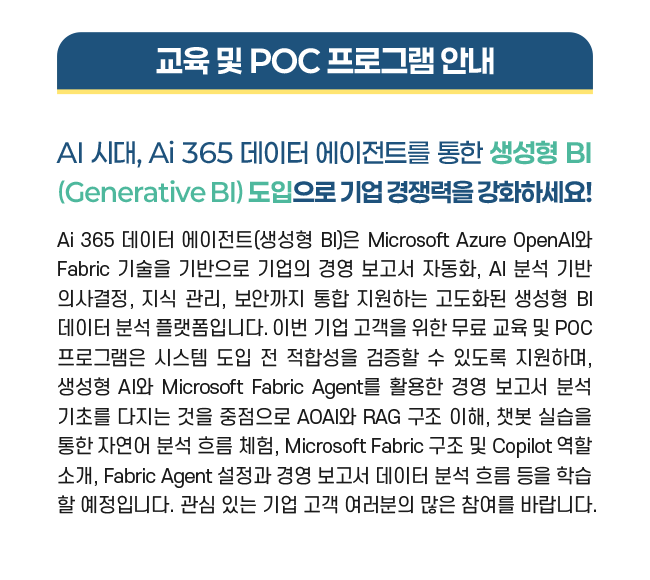 Ai 365 데이터 에이전트(생성형 BI)은 Microsoft Azure OpenAI와 Fabric 기술을 기반으로 기업의 경영 보고서 자동화, AI 분석 기반의사결정, 지식 관리, 보안까지 통합 지원하는 고도화된 생성형 BI데이터 분석 플랫폼입니다. 이번 기업 고객을 위한 무료 교육 및 POC 프로그램은 시스템 도입 전 적합성을 검증할 수 있도록 지원하며, 생성형 AI와 Microsoft Fabric Agent를 활용한 경영 보고서 분석 기초를 다지는 것을 중점으로 AOAI와 RAG 구조 이해, 챗봇 실습을 통한 자연어 분석 흐름 체험, Microsoft Fabric 구조 및 Copilot 역할 소개, Fabric Agent 설정과 경영 보고서 데이터 분석 흐름 등을 학습 할 예정입니다. 관심 있는 기업 고객 여러분의 많은 참여를 바랍니다.