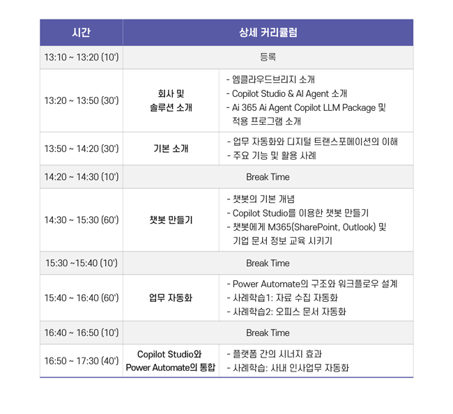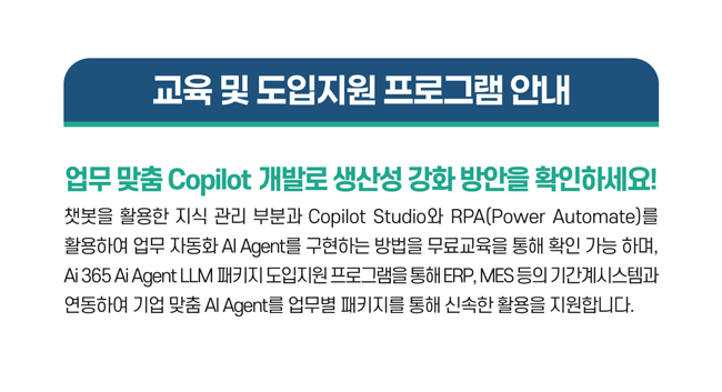 업무 맞춤 Copilot 개발로 생산성 강화 방안을 확인하세요! 챗봇을 활용한 지식 관리 부분과 Copilot Studio와 RPA(Power Automate)를 활용하여 업무 자동화 AI Agent를 구현하는 방법을 무료교육을 통해 확인 가능 하며, Ai 365 Ai Agent LLM 패키지 도입지원 프로그램을 통해 ERP, MES 등의 기간계시스템과 연동하여 기업 맞춤 AI Agent를 업무별 패키지를 통해 신속한 활용을 지원합니다.