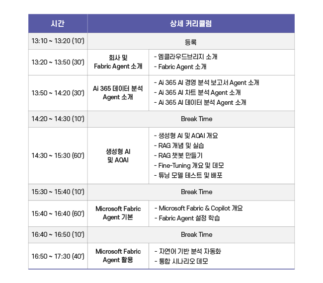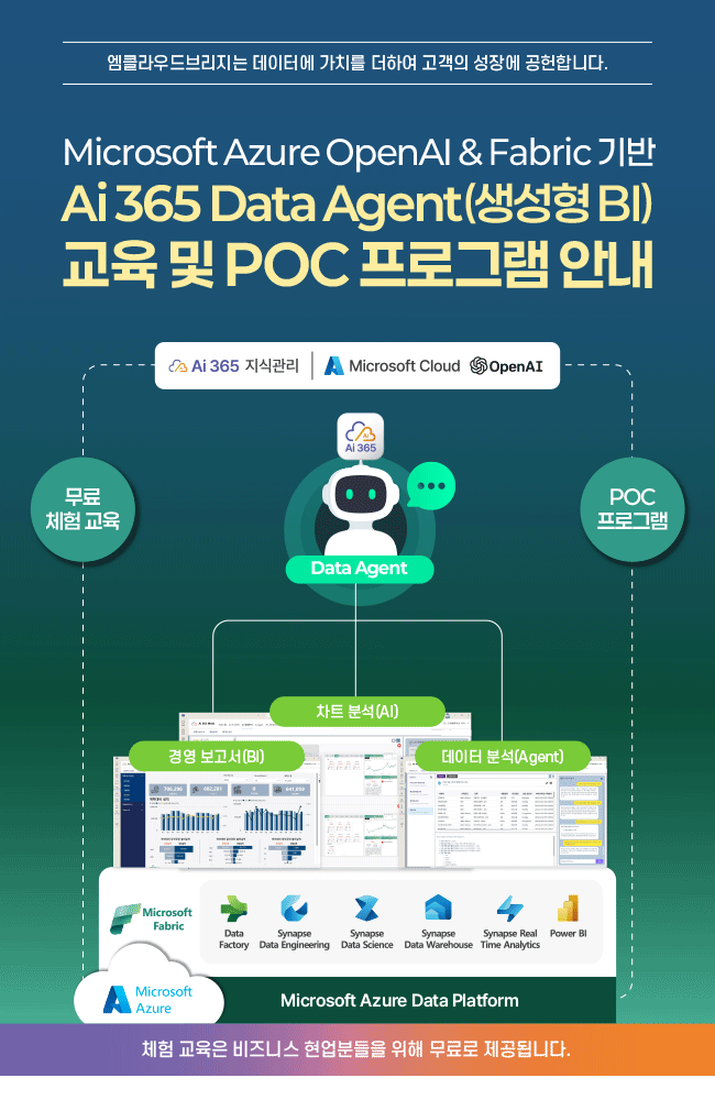 Ai 365 데이터 에이전트(생성형 BI)은 Microsoft Azure OpenAI와 Fabric 기술을 기반으로 기업의 경영 보고서 자동화, AI 분석 기반의사결정, 지식 관리, 보안까지 통합 지원하는 고도화된 생성형 BI데이터 분석 플랫폼입니다. 이번 기업 고객을 위한 무료 교육 및 POC 프로그램은 시스템 도입 전 적합성을 검증할 수 있도록 지원하며, 생성형 AI와 Microsoft Fabric Agent를 활용한 경영 보고서 분석 기초를 다지는 것을 중점으로 AOAI와 RAG 구조 이해, 챗봇 실습을 통한 자연어 분석 흐름 체험, Microsoft Fabric 구조 및 Copilot 역할 소개, Fabric Agent 설정과 경영 보고서 데이터 분석 흐름 등을 학습 할 예정입니다. 관심 있는 기업 고객 여러분의 많은 참여를 바랍니다.