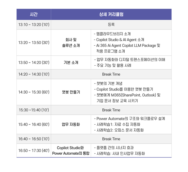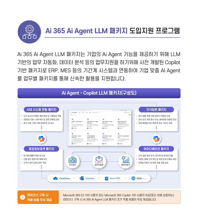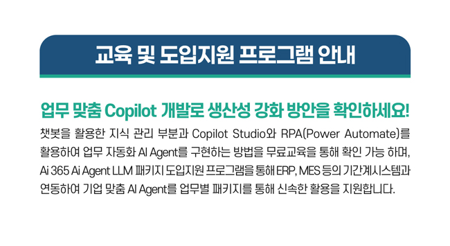 업무 맞춤 Copilot 개발로 생산성 강화 방안을 확인하세요! 챗봇을 활용한 지식 관리 부분과 Copilot Studio와 RPA(Power Automate)를 활용하여 업무 자동화 AI Agent를 구현하는 방법을 무료교육을 통해 확인 가능 하며, Ai 365 Ai Agent LLM 패키지 도입지원 프로그램을 통해 ERP, MES 등의 기간계시스템과 연동하여 기업 맞춤 AI Agent를 업무별 패키지를 통해 신속한 활용을 지원합니다.